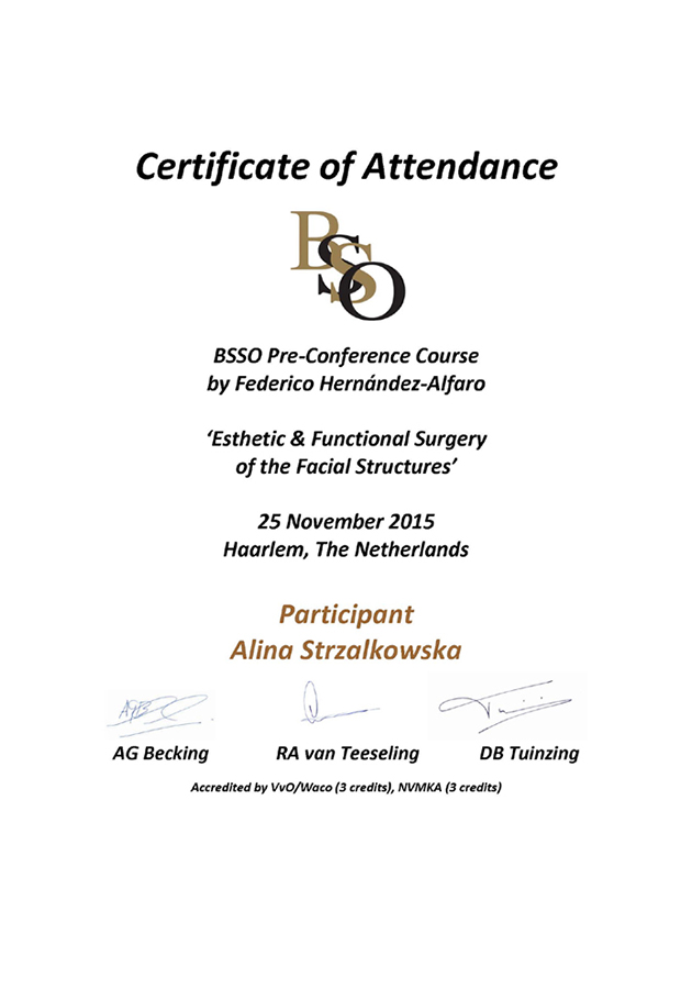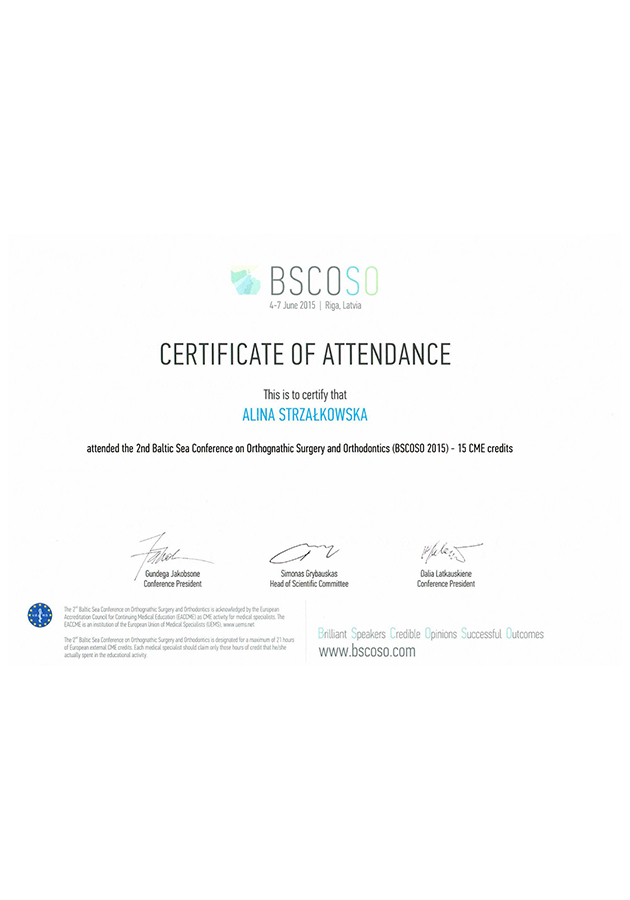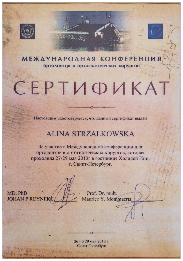 • 26.09.2014 – “Surgical treatment of class II maloclussions with the use of Herbst hinges as an orthodontical support perioperative period” – „Chirurgiczne leczenie wad klasy II z użyciem Zawiasu Herbsta jako wspomagania ortodontycznego w okresie okołooperacyjnym” – XXII Congress of the European Association for Cranio-Maxillo Facial Surgery – plakat Praga. R. Sadowski, A. Strzałkowska