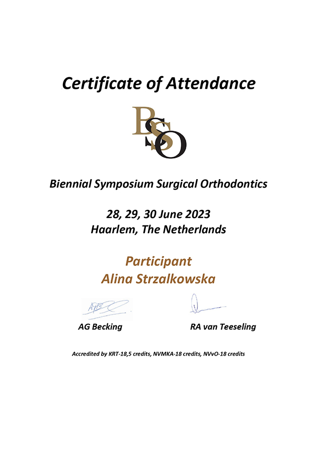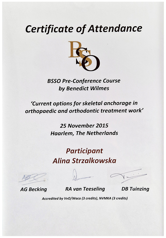 • C. „Zastosowanie mikroimplantu ortodontycznego do kompresji tylnej szerokości górnego łuku zębowego” – A. Strzałkowska, A. Kunc – plakat
