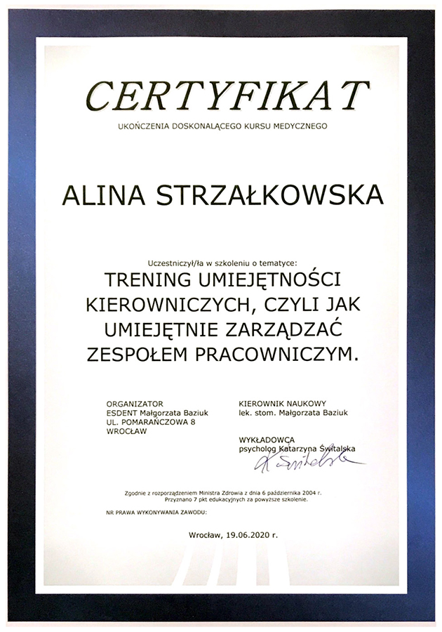 Praca z moimi wyjątkowymi współpracownikami to przyjemność. Uważam, że kluczem do sukcesu jest nie tylko wiedza i doświadczenie, ale również empatia, zrozumienie i wzajemny szacunek. Z pełnym przekonaniem dzielę się z nimi wszystkim, co sama zdobyłam przez lata pracy – zarówno w zakresie wiedzy, jak i pasji do ortodoncji. Wierzę, że wspólnie możemy tworzyć wyjątkowe miejsca, w których pacjenci czują się komfortowo, bezpiecznie i pewnie. Z całego serca dziękuję moim współpracownikom za ich zaangażowanie, pasję i serce, które wkładają w swoją pracę. Ortodoncja to nie tylko moja praca, to moja życiowa misja.