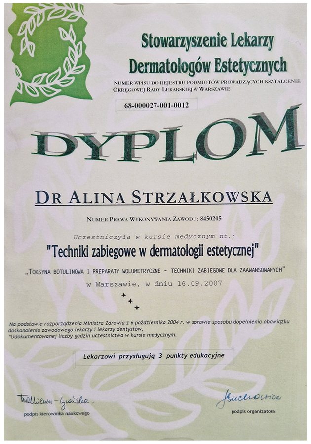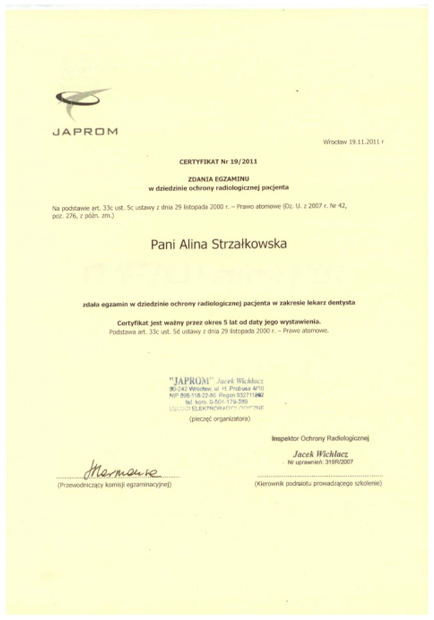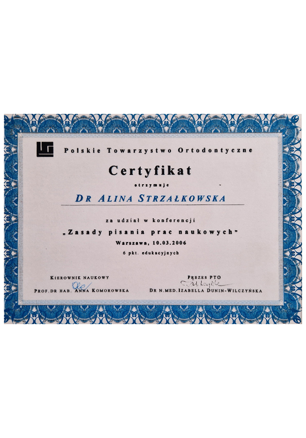 • 04.2007 – Moja Praktyka, lato 2007, nr 2 (31), s. 3 – „Tomografia komputerowa – precyzyjne narzędzie diagnostyczne we współczesnej ortodoncji”. A. Strzałkowska, A. Wyrzykowska