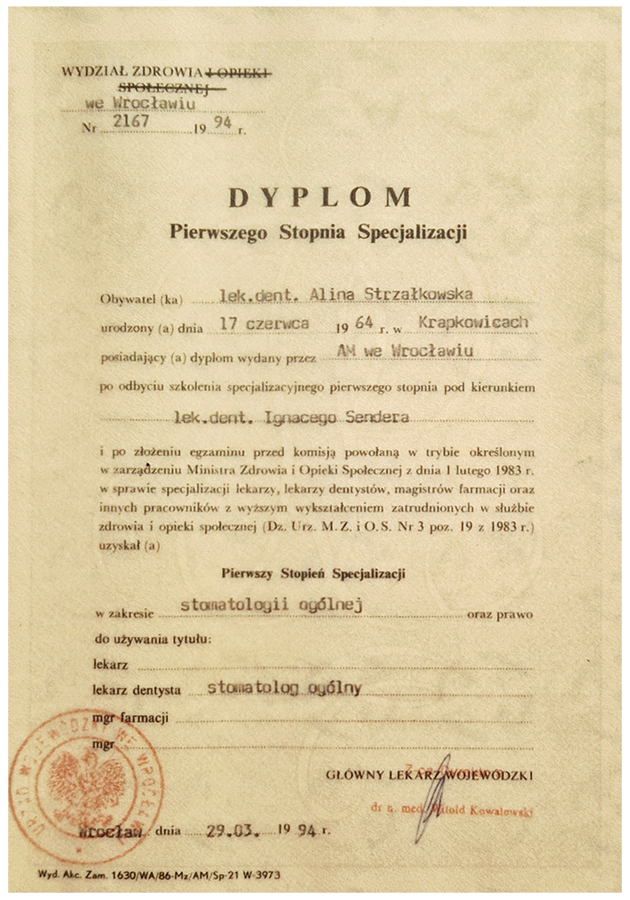• 12.03.2015 – Nadanie tytułu doktora nauk medycznych. Nadania dokonała dziekan Wydziału Lekarskiego Uniwersytetu Medycznego im. Piastów Śląskich we Wrocławiu, Oddziału Stomatologii, dr hab. Beata Kawala, prof. nadzw. 23–