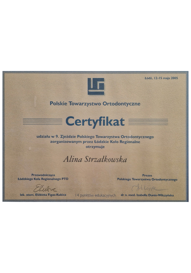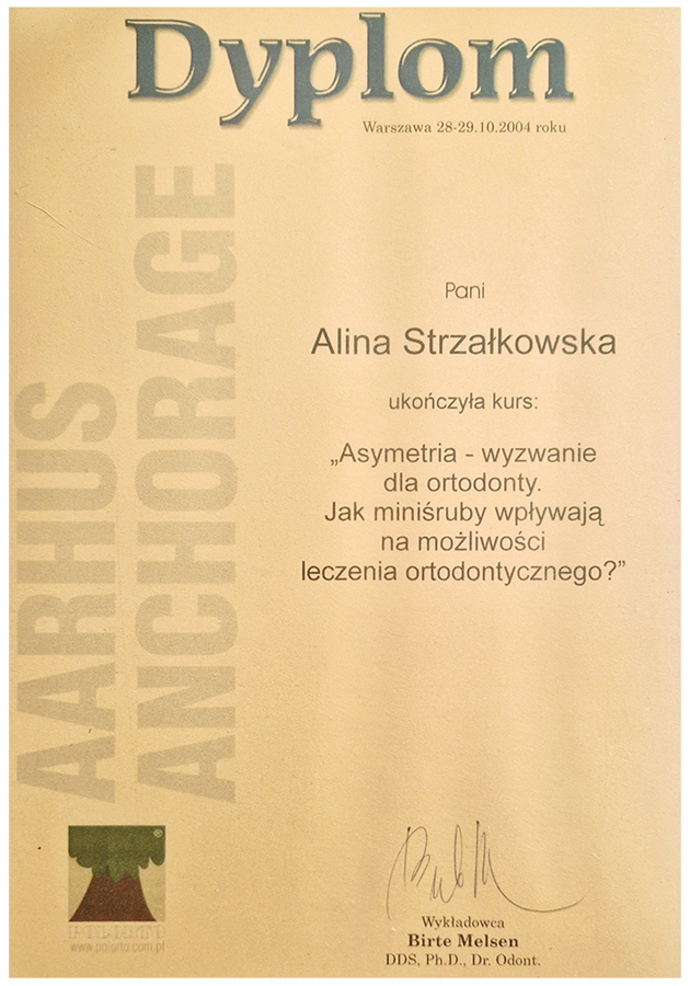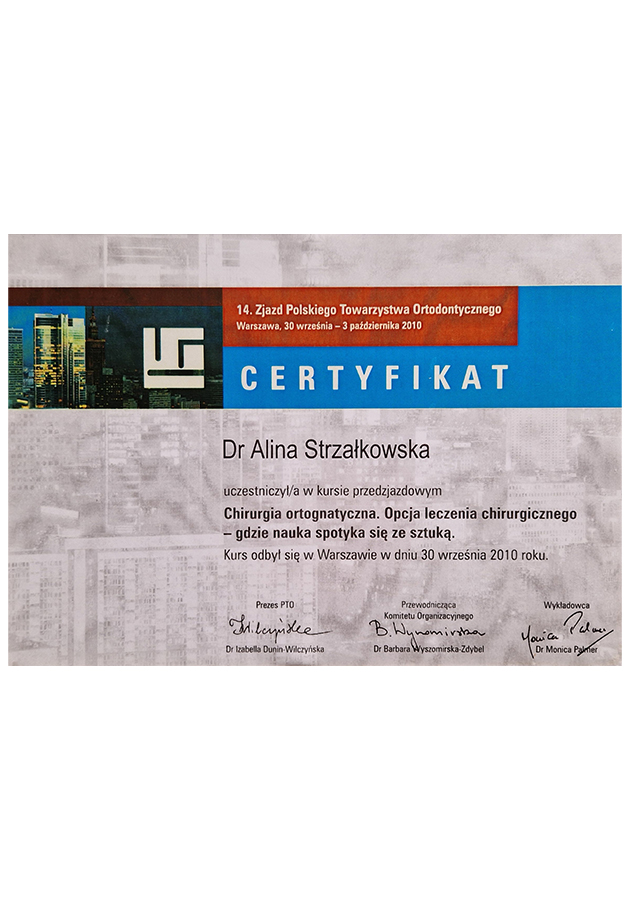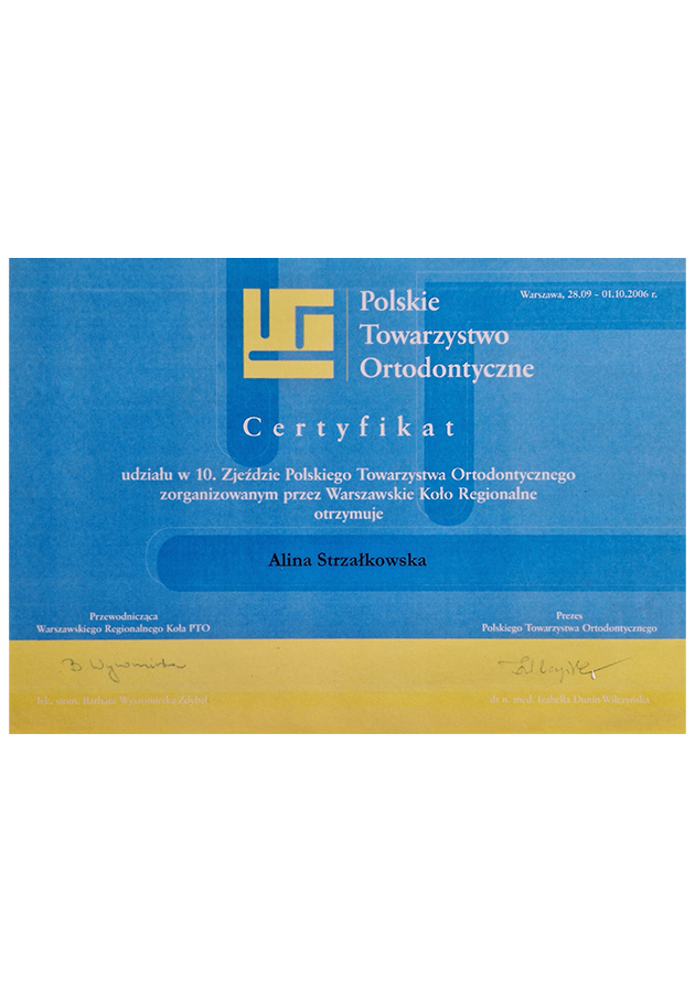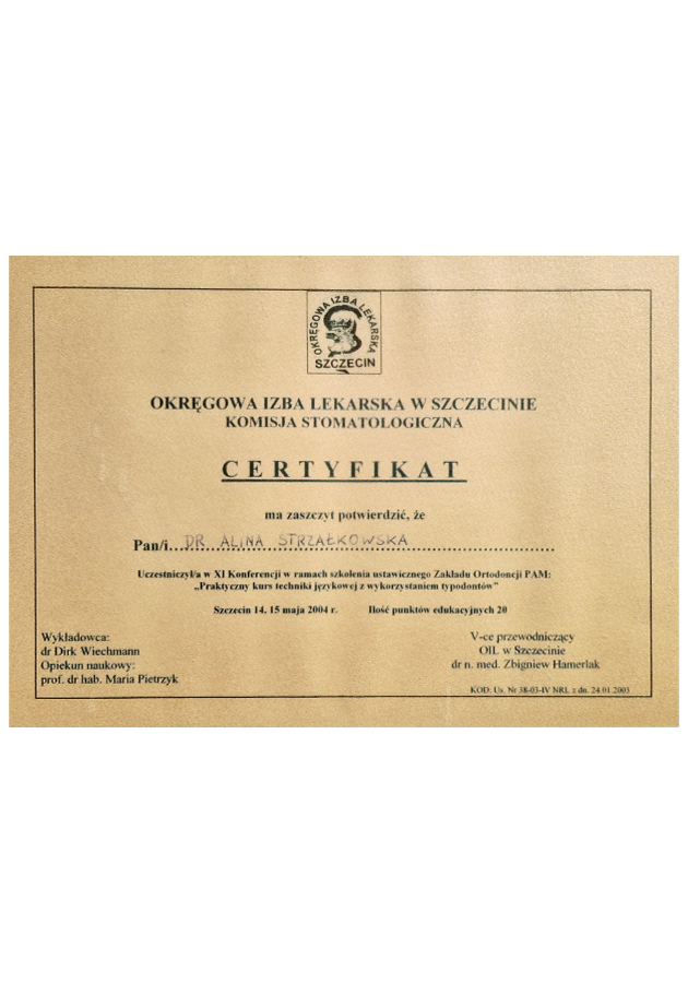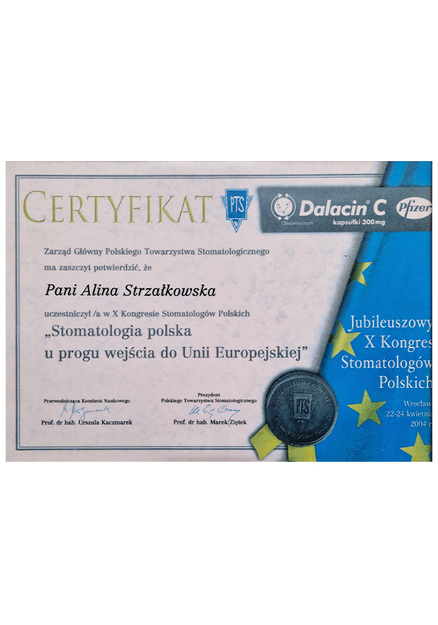 • 23–26.09.2004 – Zjazd Polskiego Towarzystwa Ortodontycznego, Opole – Materiały informacyjne (biuletyn VIII Zjazdu Polskiego Towarzystwa Ortodontycznego w Opolu, s. 15 10.20–10.30 (Wrocław – „Leczenie ortodontyczne pacjenta dorosłego z pooperacyjną dysfunkcją narządu żucia – opis przypadku”. A. Strzałkowska
