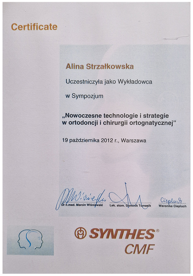 • 19.10.2012 – Wykład na forum sympozjum „Nowoczesne technologie i strategie w ortodoncji i chirurgii ortognatycznej”. „Ortodontyczno-chirurgiczne leczenie pacjentów z wadą szkieletu szczęk klasy II. Przegląd przypadków” – prezentacja. A. Strzałkowska, R. Sadowski