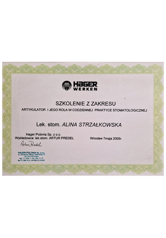 • 2007 – Protetyka Stomatologiczna.,2007,LVII,2,112-118 -„Leczenie ortodontyczno – protetyczne w przypadku braku zawiązków bocznych siekaczy w szczęce – opis przypadku ” . Alina Strzałkowska, Agnieszka Książek