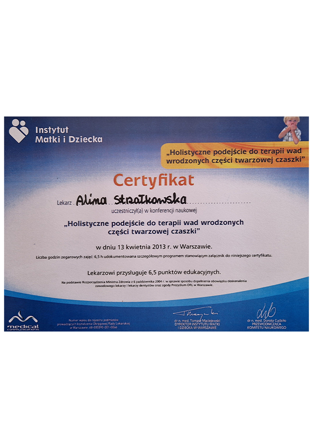 • 24–26.04.2008 – Second Scientific and Educational Conference – State of Health of Oral Cavity and Environments Conditionals Achievements of Modern Dentistry, Nałęczów – „Environmental influence on the mandible growth patterns on the basis of cephalograms patients during growth period”