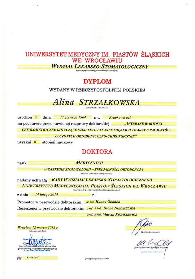 • 14.02.2014 – Obrona przewodu doktorskiego „Wybrane wartości cefalometryczne dotyczące szkieletu i tkanek miękkich twarzy u pacjentów leczonych ortodontyczno-chirurgicznie”, uwieńczona przyznaniem tytułu doktora nauk medycznych – Uniwersytet Medyczny im. Piastów Śląskich we Wrocławiu