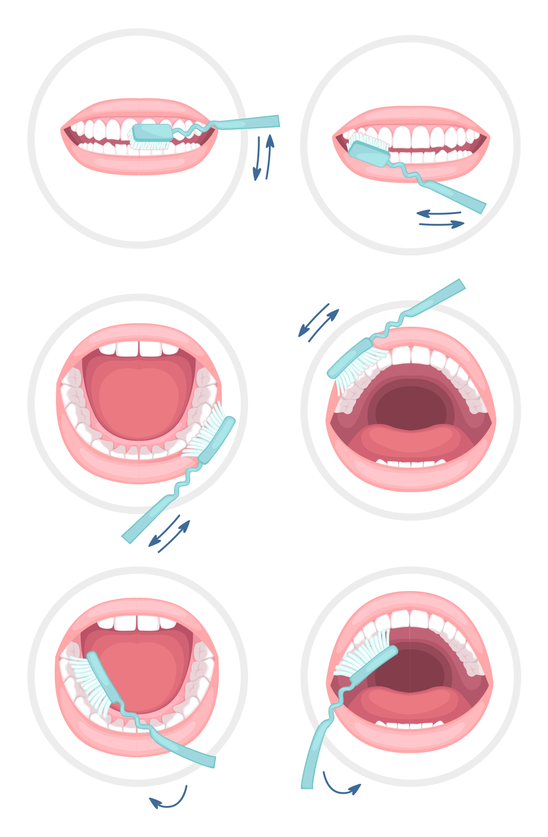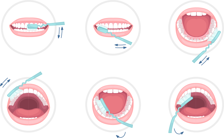 Uproszczony schemat poprawnego szczotkowania zębów.