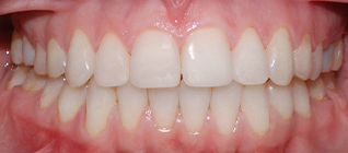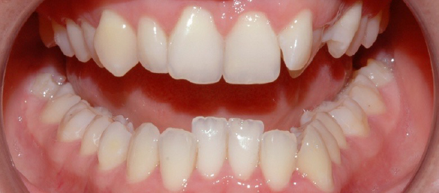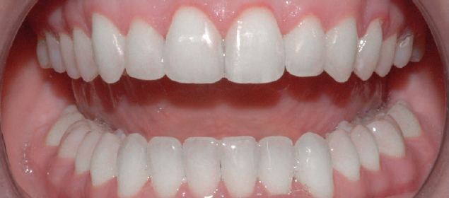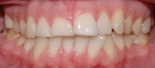 > Starte uzębienie w odcinku przednim. Na fotografii obok: zgryz po leczeniu ortodontycznym z rekonstrukcją materiałem kompozytowym.